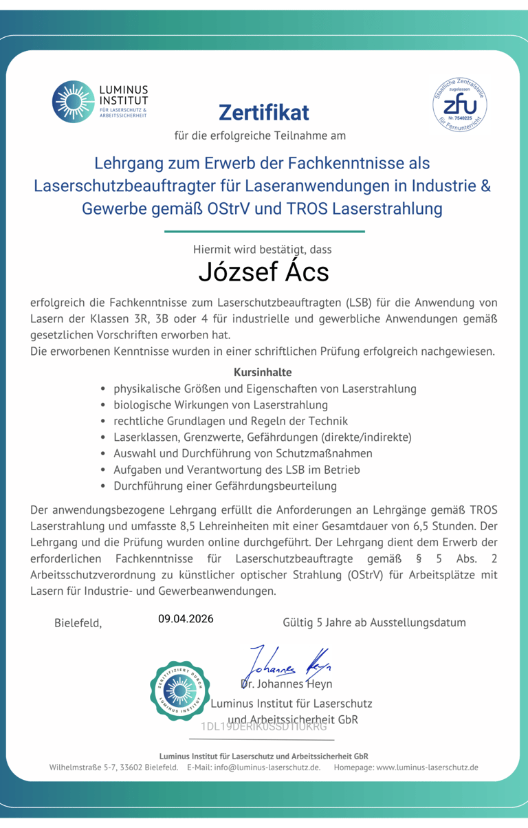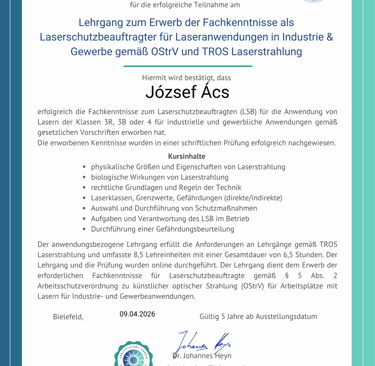 Die Laserarbeiten werden von einem zertifizierten Laserschutzbeauftragten (LSB) nach OStrV und TROS Laserstrahlung durchgeführt.